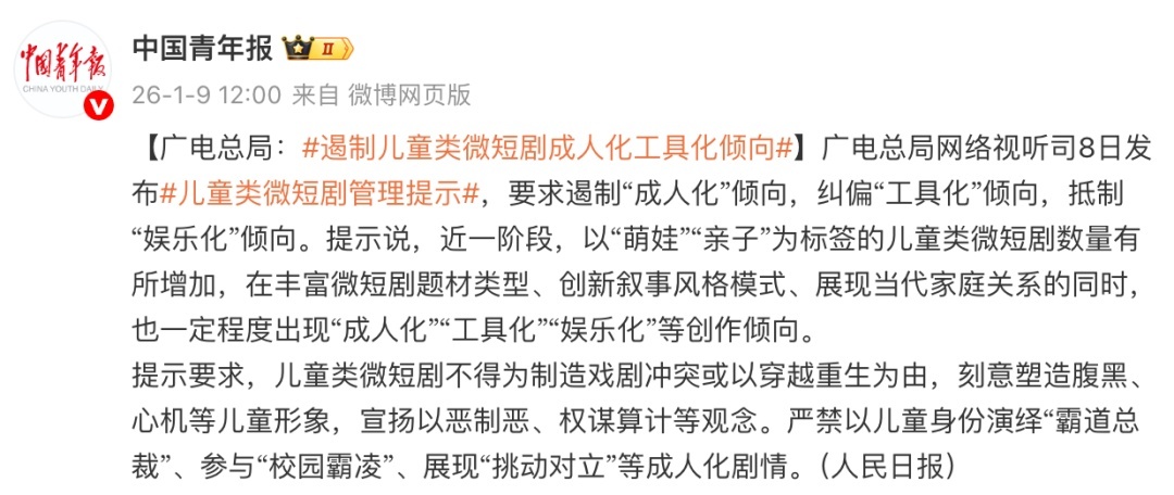 中国网络文艺知识产权纠纷人民调解委员会调解员、中国执业律师缪蒙京告诉记者,从法律视角审视,该剧已明确触碰红线:其内容违反了《中华人民共和国未成年人保护法》及《未成年人节目管理规定》中严禁渲染未成年人成人化情感的规定,也直接违背了广电总局关于儿童不得出演成人化剧情的要求。行政层面,下架、罚款等处罚是必然结果。